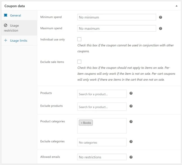 In our example, we’ve restricted the discount to the Books category by using the Product categories field.