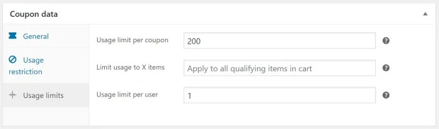 Here, you can specify how many times the coupon can be used per customer and in total. You can also define the number of products it can be applied to at once. In the screenshot above, you’ll see that we’ve specified that the coupon once by customer, and by 200 customers altogether.